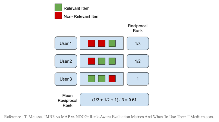 MRR의 가장 큰 장점은 간단하고 쉽다는 점이며, 상위의 관련된 컨텐츠에만 집중하기 때문에, 사용자와 관련있는 컨텐츠가 최상위에 있는가를 평가하기 위해서 용이한 지표라고 볼 수 있다. 또한, 새로운 컨텐츠가 아닌 이미 사용자가 알고 있는 컨텐츠 중 가장 선호할만한 컨텐츠를 보여주고자 할 때 좋은 평가 기준이 된다고 한다.