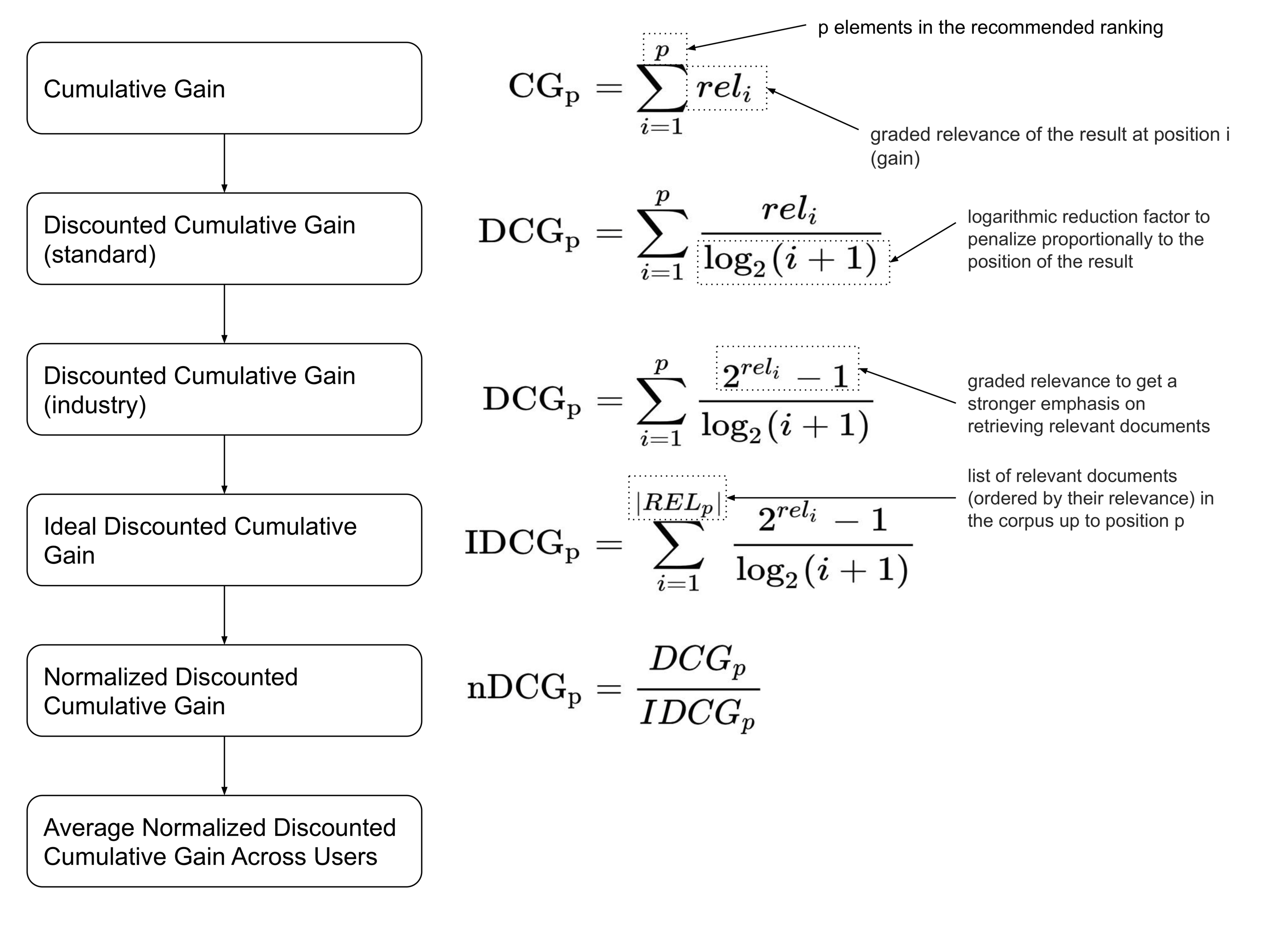 nDCG는 MAP를 이용하여 얻고자 하는 목표와 크게 다르지 않지만, MAP에서의 이분법적인 구분 지표에 대해서만 사용할 수 있는 지표를 보완한다는 점에서 가장 유용하다고 볼 수 있다. 계산 방법은 아래와 같다.
