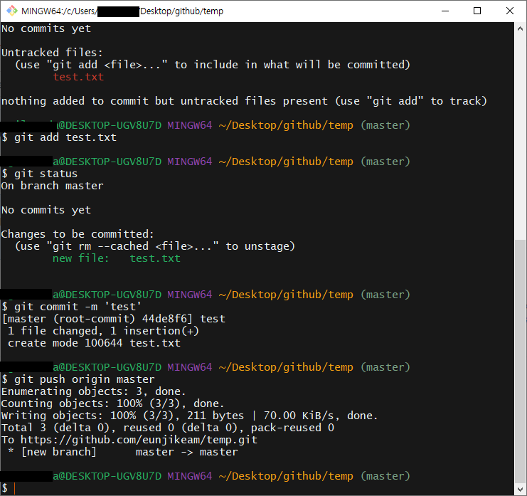 전부 생성을 하고 나서, github의 해당 repository에 들어가면 test.txt가 업로드되어있는 것을 확인할 수 있다.