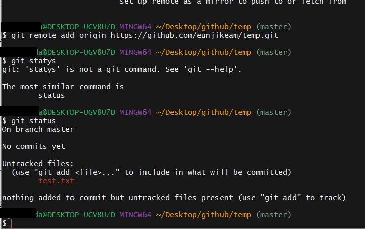 그리고 test를 위해 새로운 파일을 생성해놓는다. 나는 test.txt 파일을 만들어보려고 한다. test 파일을 만들고 나서 git status를 확안해보자.