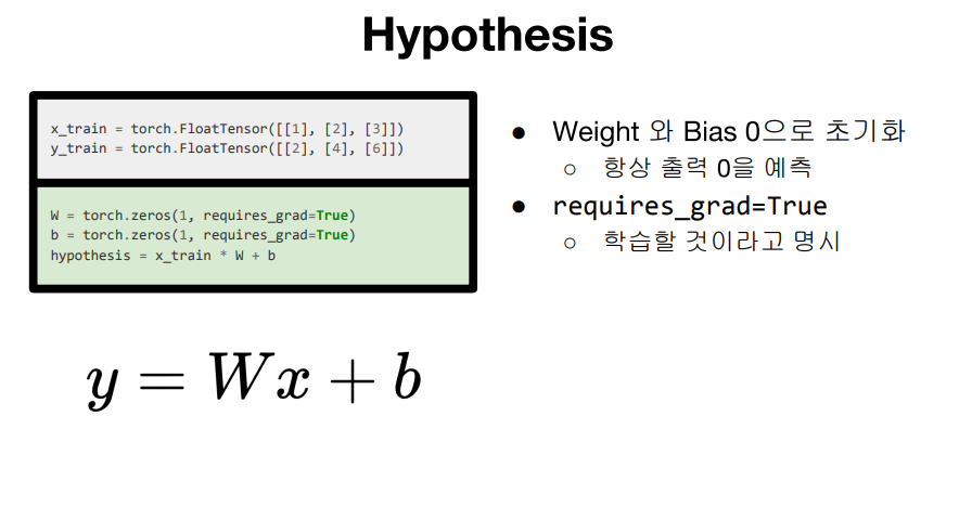 W = torch.zeros(1, requires_grad = True) # W를 학습할 것이라고 명시