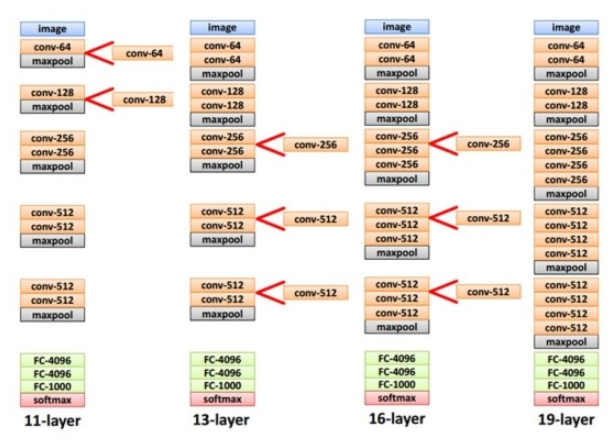 신경망 모델의 깊이(모델의 레이어 수)에 따라서 VGG11, VGG13, VGG16, VGG19 등으로 나타낼 수 있다.