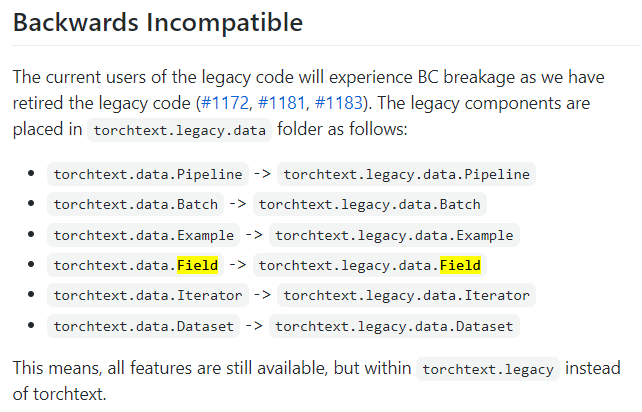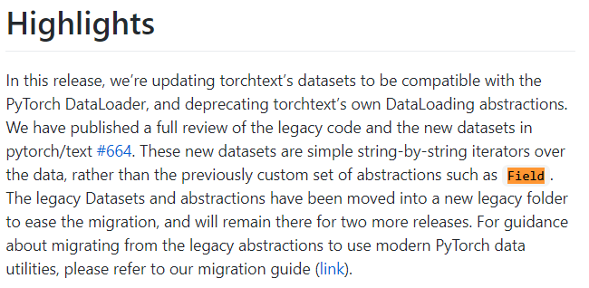 그래서 현재 우리가 사용하려는 Field 클래스는 torchtext의 legacy에 있으니 참고해서 불러오면 될 듯하다. (그런데 파이토치에서 Dataloader를 통일하기 위해 추상화 클래스를 중단한 건데 굳이 legacy에 가서 사용해야할까 싶긴하다. torchtext를 사용하지 않고도 구성할 수 있도록 해보자.)