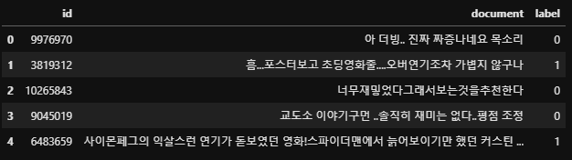 데이터의 형태는 아래와 같다. document는 영화 리뷰, label은 긍정 부정에 대한 라벨, id는 불필요하다.