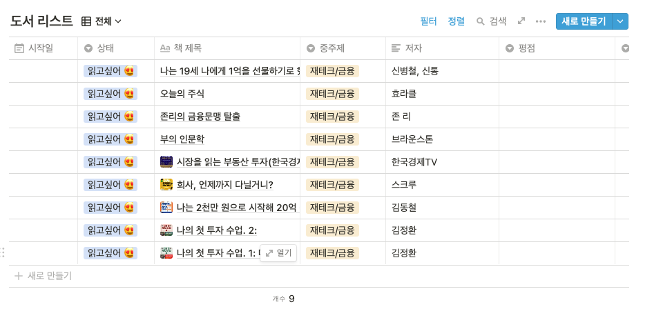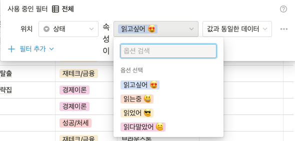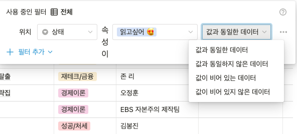 현재 상태 컬럼에서 <읽고싶어> 옵션, 그리고 중주제 <제태크 금융>을 필터링 한 결과이다. 오른쪽 상단에 파란색으로 필터라고 적혀있음으로써 필터링이 적용되어있는 것을 알 수 있다.