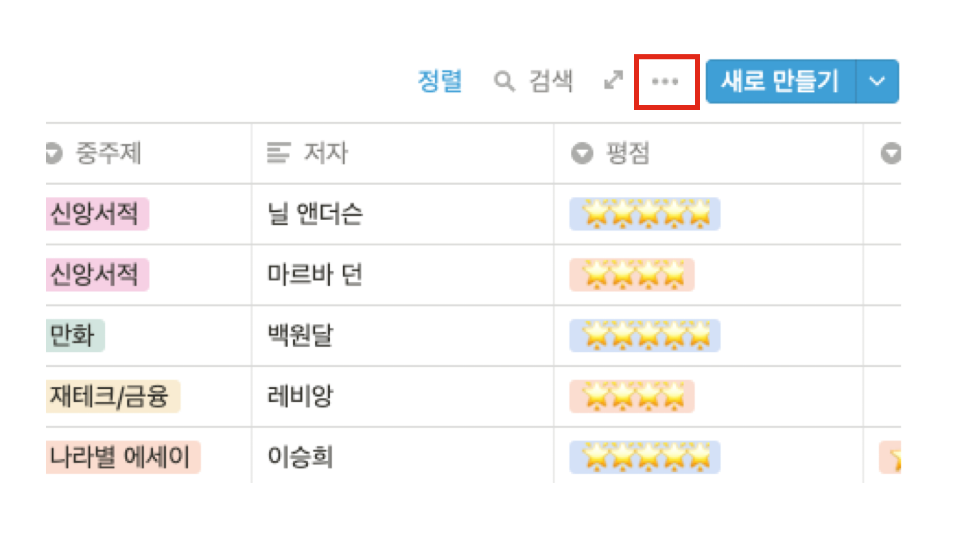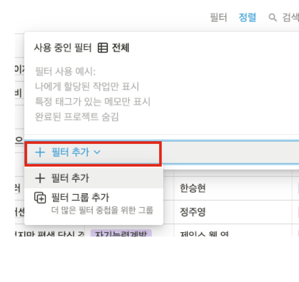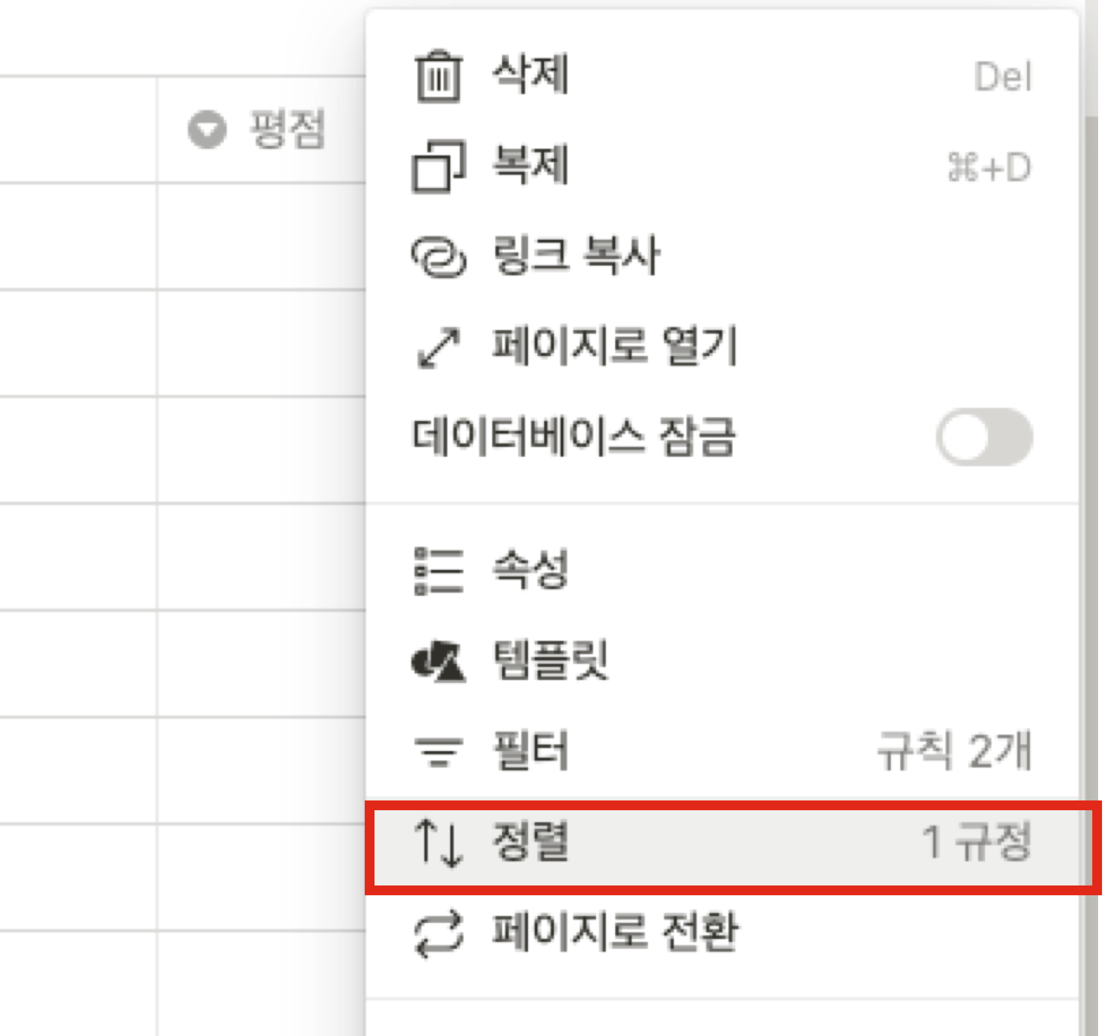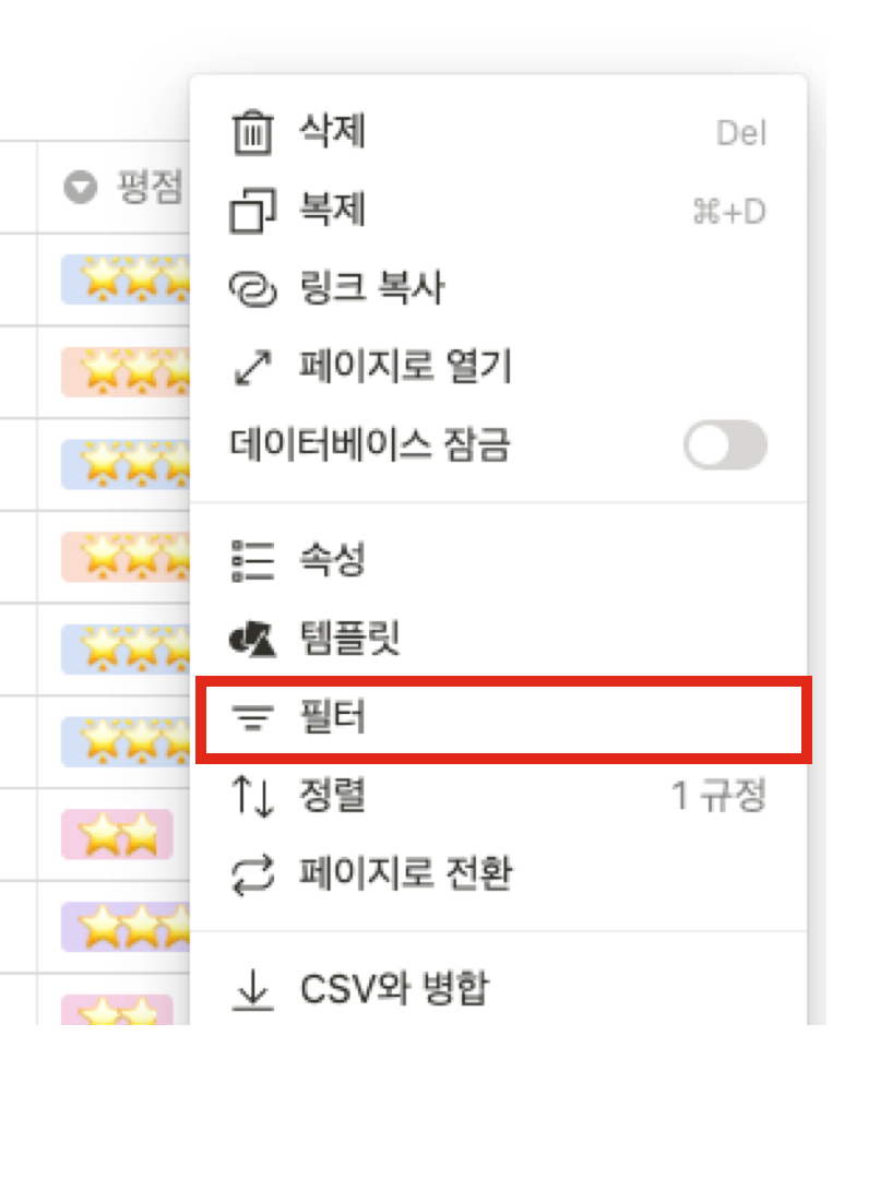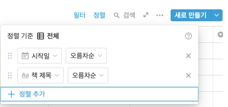 정렬을 생성하는 것도 필터와 비슷하다. 데이터베이스의 오른쪽 상단의 점 세개(더보기)를 클릭한 후 정렬을 클릭해준다.
