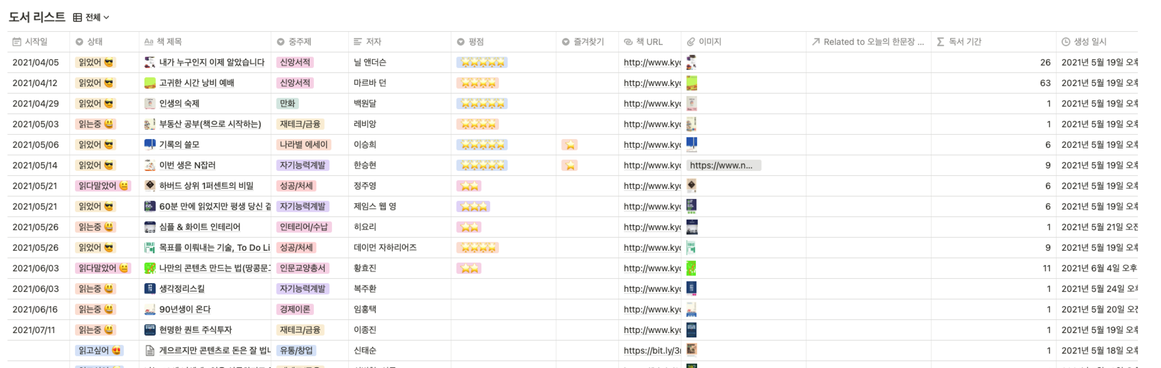 아래 현재 내가 사용하고 있는 독서 기록표에 대한 데이터베이스이다. 주제, 상태, 평점 등이 태그 속성으로 이루어져 있으며 시작일, 생성일 등이 날짜로 이루어져 있다. 이 데이터베이스를 이용해서 필터링과 정렬을 적용해볼 예정이다.