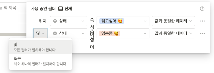 도서리스트 중주제가 <에세이> 이고 상태가 <읽는 중> 인 것을 뽑고 싶다면 -> 필터 그룹 추가