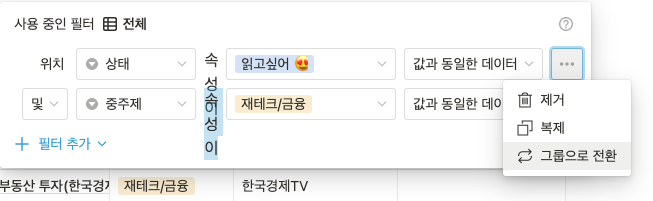 또한 아래 사진과 같이 ...을 클릭하여 단순 필터였던것을 필터 그룹으로 전환할 수도 있다.
