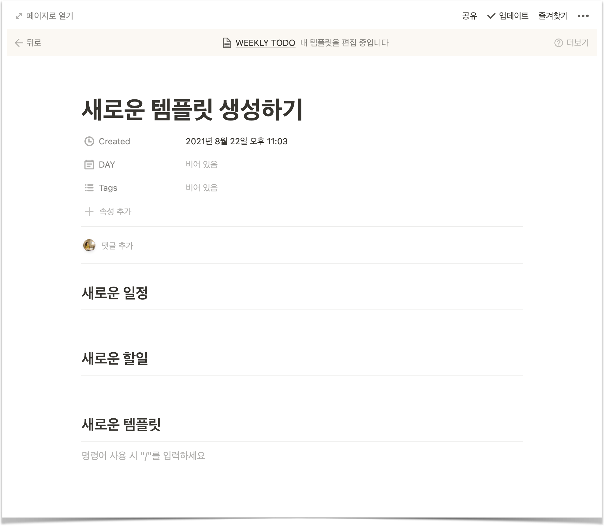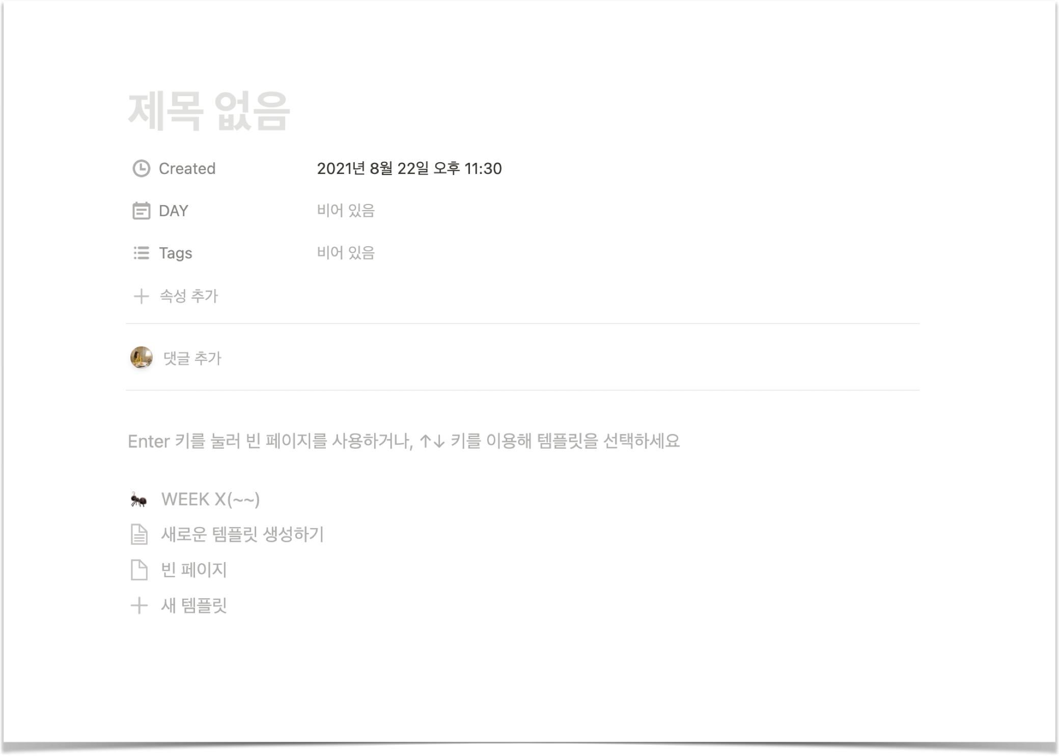그럼 아래와 같이 빈 페이지를 생성한 것과 동일한 모양의 페이지가 나온다. 이 안에서 자유롭게 편집을 해주면 되며, 제목란에 템플릿 이름을 입력하면 나중에 템플릿 목록에 출력되게 된다.