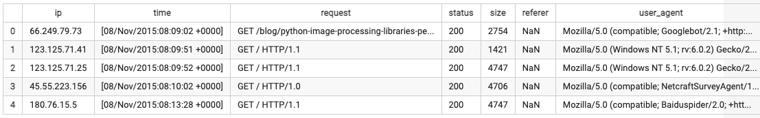 names=['ip', 'time', 'request', 'status', 'size', 'referer', 'user_agent'],
