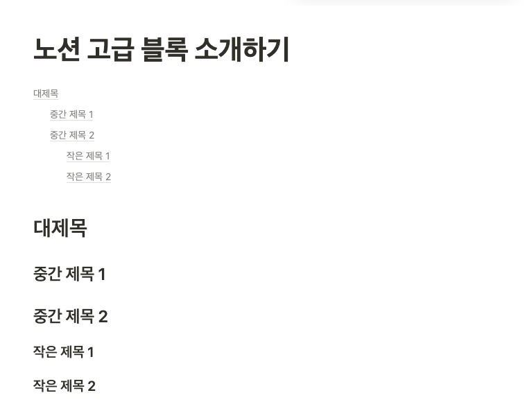 노션의 목차 기능은 해당 페이지 내의 제목들을 보여주고, 링크해주는 기능이다. #을 이용해서 제목들을 작성하고, 목차 블록을 생성하면 아래와 같이 목제목들이 나열되어있는 블록을 생성할 수 있다.